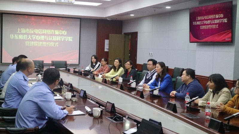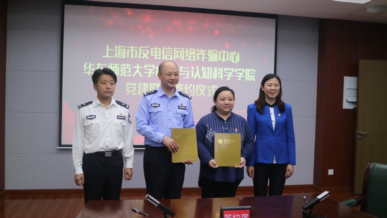 10月16日下午,华东师大幸运飞艇 与上海市反电信网络诈骗中心举行党建联建签约仪式。上海市公安局刑侦总队副总队长姜伟良、九支队政委钱世平、文保分局刑侦大队副大队长徐凤伟及幸运飞艇 党委书记方媛、党委副书记兼副院长庄瑜、党委委员孟慧、刘晓陵、教师代表李林及辅导员、学生党支部书记参加了签约仪式。