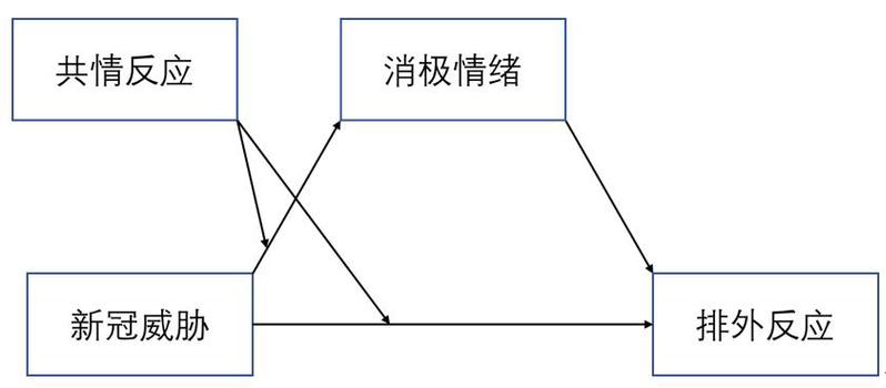 已有研究显示,共情反应可能是疾病威胁影响其潜在负面影响的一种缓冲因子。共情反应(empathic responding)是指个体试图理解他人的感受,并提供相关的支持和帮助。研究发现,共情反应可作为一种应对策略来应对疾病威胁。如有研究者报告,那些报告更多投入共情反应的个体,对潜在的SARS患者表现出更少的回避行为,并且他们也倾向采取有效的预防性措施。并且,共情反应在非典型肺炎(SARS)、西尼罗河病毒(West Nile)和甲型流感(H1N1)等多种疾病威胁背景下表现出类似的积极作用。共情反应由此被相关学者视为一种应对疾病威胁的有效策略并推荐使用。基于这些证据,本研究假设共情反应可以缓解新冠疾病威胁对排外反应的影响。本研究的理论模型见下图。