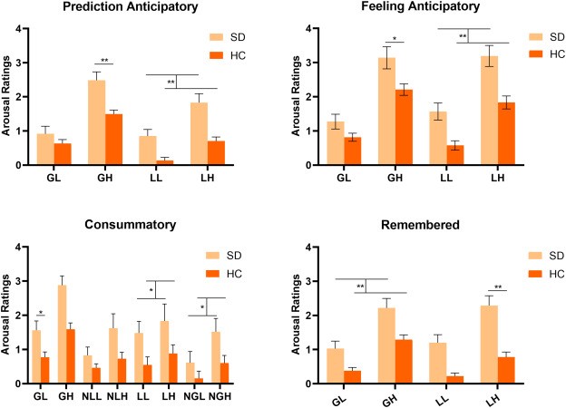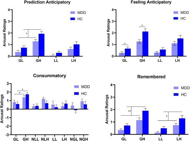 (注:四个图表表示MDD组及其对照组在收益,损失,无收益和无损失条件下的预期,即时和回忆的情绪反应的价态评级。GL/GH:收益条件下的低/高情绪反应性;NGL/NGH:无收益条件下的低/高情绪反应性;LL/LH:损失条件下的低/高情绪反应性;NLL/NLH:无损失条件下的低/高情绪反应)