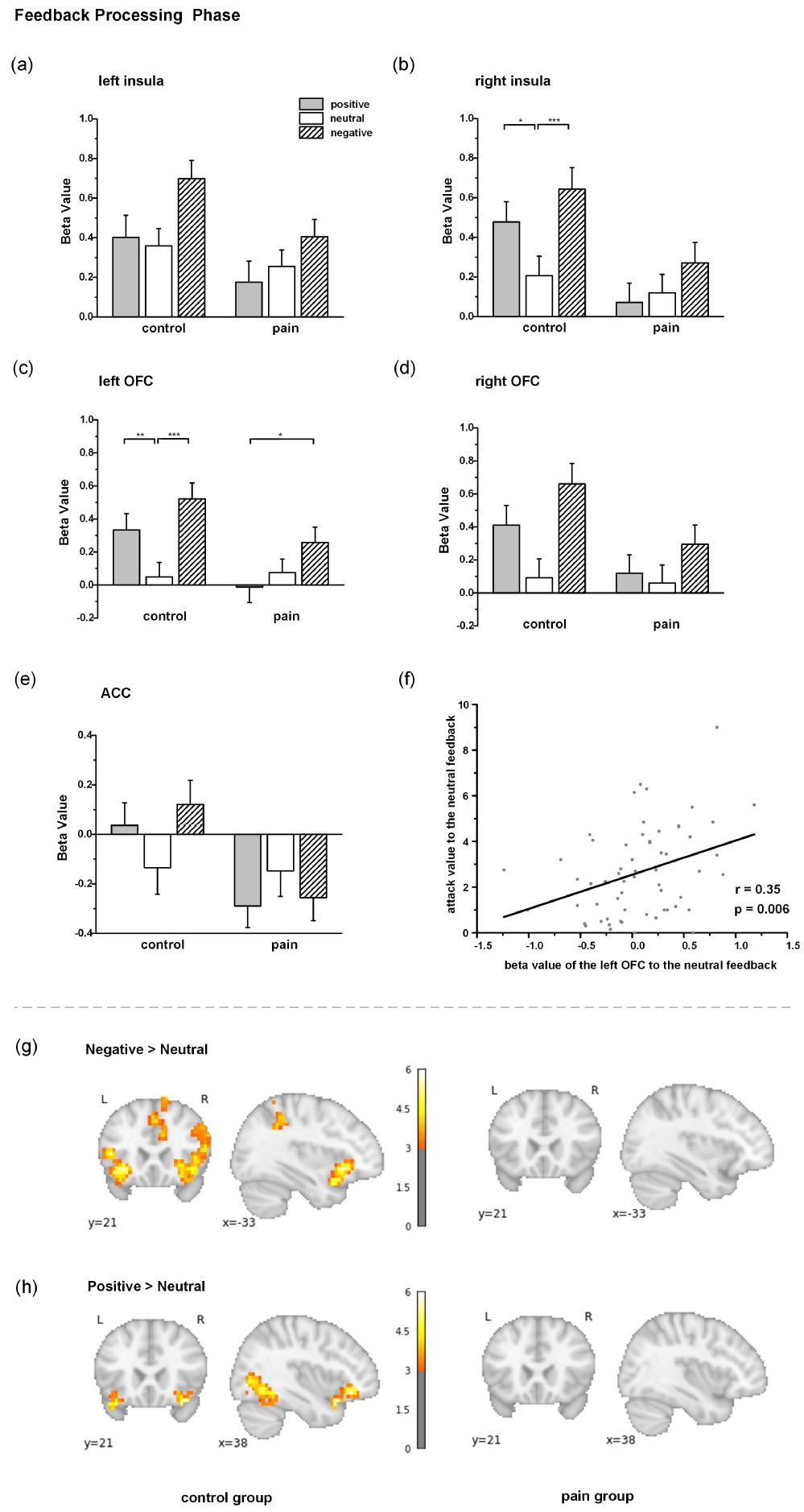 在社会反馈信息加工阶段,主要关注突显网络(salience network)与价值表征系统(value representation system)的脑活动。结果发现,正常情况(非疼痛条件)下,正性和负性反馈相比于中性反馈,右侧脑岛(right Insula)、前扣带回(ACC)与左侧眶额叶皮层(left OFC)会有更强的脑活动。然而,有趣的是,生理性疼痛显著地降低了以上脑区活动,使这些脑区对负性、中性和正性的社会反馈进行无差别表征(图3)。这表明,疼痛可能抑制了人际交互过程中的社会信息加工。