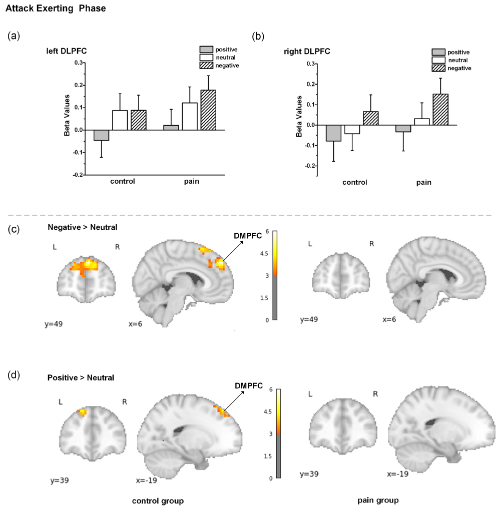 在攻击实施阶段,主要关注执行功能网络(executive functioning network)中的背外侧前额叶皮层(DLPFC)的活动。结果发现,疼痛并不影响攻击实施时DLPFC的脑活动(图4)。这表明,疼痛所增加的攻击行为,可能并不是由于直接影响了大脑的执行功能。