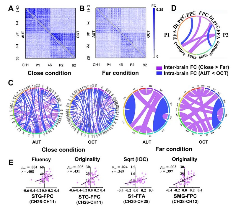 本研究发现证实了空间距离和注视角度对创造性言语交流的影响,初步揭示了效应背后的脑间神经互动机制,为进一步探索非言语要素对人际交流的影响提供了一个新的、可量化的神经实验范式。实践意义方面,本研究发现也为提升团体创造性交流的效率,增进团体创造性表现提供了有益的启发。