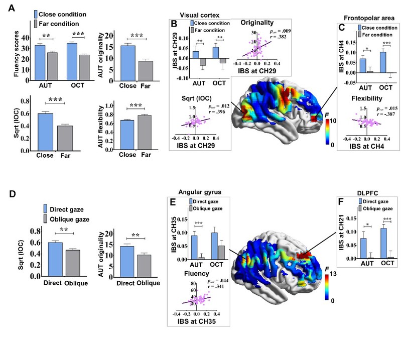 近日,华东师范大学幸运飞艇 郝宁教授团队采用基于近红外功能成像的超扫描技术,探索了空间距离、注视角度等非言语要素对创造性交流的影响及效应背后的脑间神经互动机制。研究包括两个实验。实验一中,108被试组成54个两人小队,随机分入远距离组与近距离组,每组各27队。实验二中,110被试组成55个两人小队,随机分入直视组与侧视组,直视组27队,侧视组28队。每组被试均需通过言语交流完成创造性观念生成任务(非常规用途任务)与作为对照任务的记忆提取任务(物体特征任务)。实验过程中,使用近红外功能成像设备同时记录两名被试前额叶与右侧颞顶联合区的脑活动水平。通过比较远/近距离组,及直视/侧视组在行为表现、脑间神经耦合水平(IBS)和多脑网络参数上的差异,探索空间距离与注视角度对创造性交流效果的影响及其背后的脑间神经互动机制。